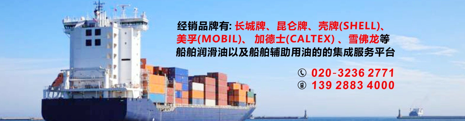 公司代理中石化長城潤滑油以及中石化國際品牌SINOPEC潤滑油,經銷品牌有昆侖牌、殼牌(SHELL)、美孚(MOBIL)加德士(CALTEX)、雪佛龍(CHEVRON)是船舶潤滑油以及船舶輔助用油的的集成服務平臺,也可按照船東要求提供船舶消防救生用品、勞保用品、五金燈具及甲板用品等船舶配套產品。